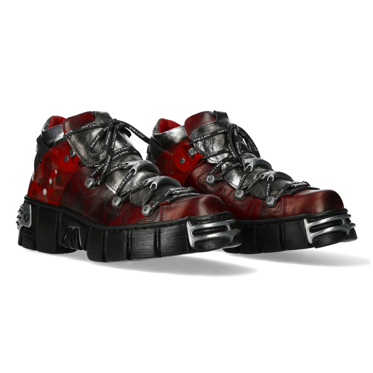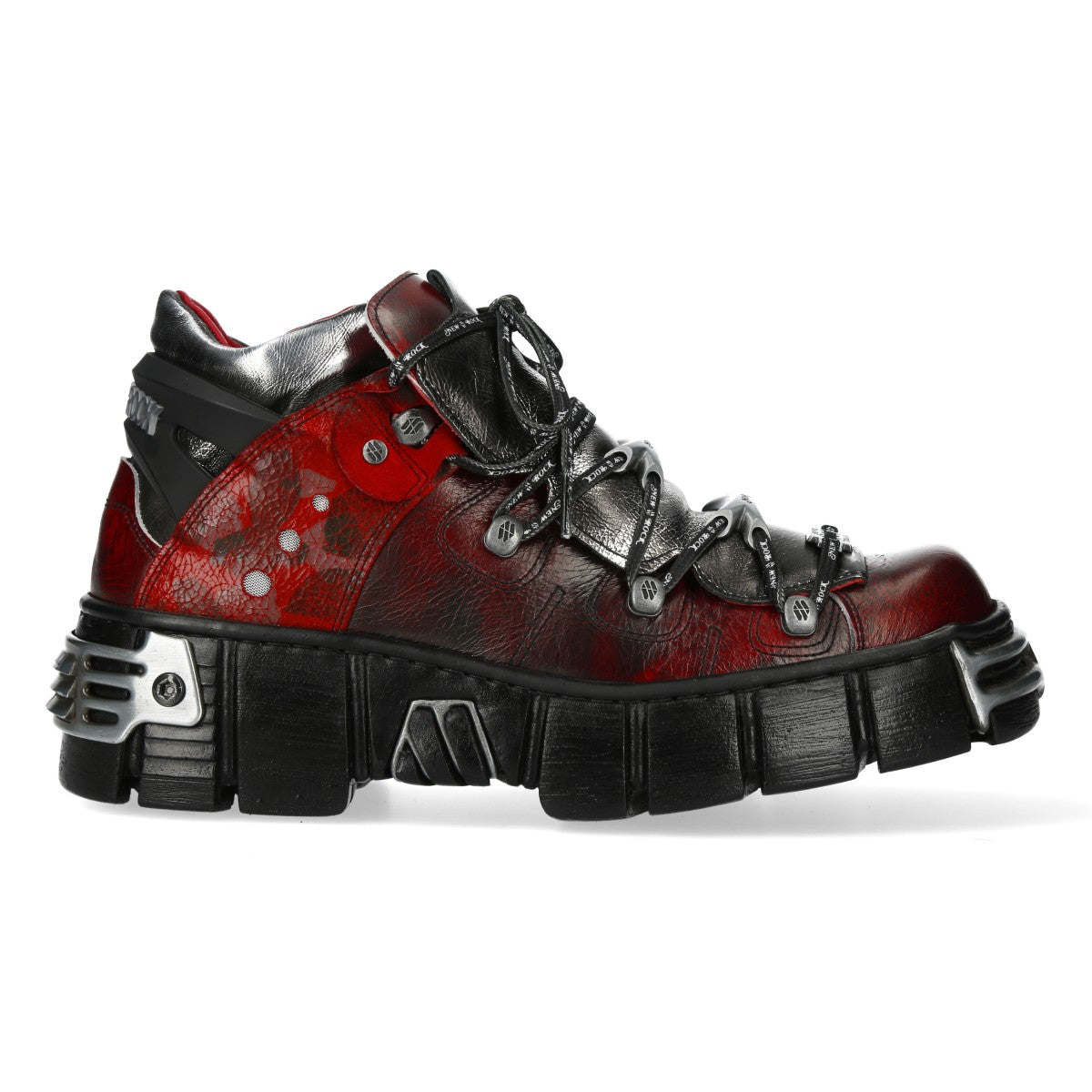 Step into bold style with the New Rock Metallic Ankle Boot M-WALL106N-C21. This tactical, gothic-inspired platform boot from the Metallic Collection is lightweight but heavy in attitude.